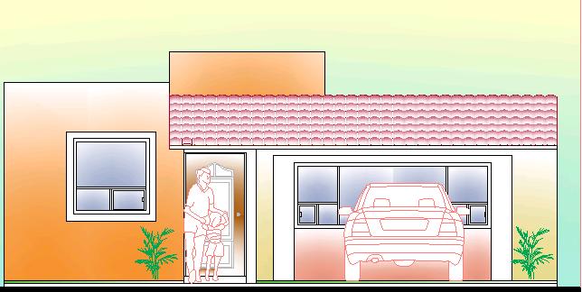 mini-casa 35N Año de Diseño: 2010 Estilo, tipología, influencia: Popular, Social Proyecto: Godofredo Oscós Flores Terreno: 8.00 m. x 10.50 m. Superficie de construcción. 34.645 m2 Programa Arquitectónico (7 espacios): PLANTA BAJA: 1- Cochera, 2- Sala-comedor-cocina, 3- Recámara 1 matrimonial, 4- Recámara 2 compartida, 5- Baño en 3 separaciones, 6- Patio de Servicio, 7- Jardín. Descripción: Casita para una pareja con dos niños o dos niñas pequeños, sólo las recámaras se plantean en losa de concreto armado, el espacio de sala-comedor-cocina puede ser una cubierta de bajo costo en láminas prefabricadas comerciales imitación teja o teja recuperada de otras construcciones. | |